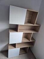 étagère moderne en panneaux mélaminés imitation bois clair, avec portes blanches laquées. Design original en forme d’escalier, parfait pour un salon,