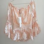 Sublime blouse femme de couleur péche saumon élégante dentelle en transparence . Encolure bateau élastique sur les épaules. Manche