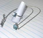Zilveren sieradenset met licht blauwe topaas, bestaande uit een ring en een ketting. Beide sieraden zijn voorzien van een 8x8 mm s