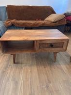 Houten salontafel met rotan accent. Afmetingen: l90xb45,5xh43 schuif gaat langs 1 kant wat stroever open, onderkant langs 1 kant wat losgekomen (zie foto) rechtse poot heeft geen bescherming meer (zie