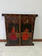Mirroir vintage indien avec portes (qui calent un peu) , peinture d'un couple , +- 61,5 cm x 64cm , bon état mais la peinture est un peu abîmée et le revêtement du miroir à une petite griffe à l&#
