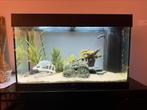 6 verschillende beelden en planten, filter + verwarming zitten bij aquarium inbegrepen. Aquarium zelf is 80x35x50cm en in perfecte