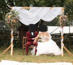 Een houten prieel dat met een witte doek en wat bloemen het perfecte sierstuk is voor een photoshoot of voor een huwelijk. Er zitt