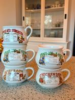5 soepkommen. Steeds de soep en ingrediënten erop (in het engels). 4 Varianten: onion soup (2x), mushroom, chicken soup en potage