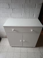 Wit houten kastje te koop met lade en deurtjes. Heel stevig, met gebruikssporen (zie foto's). Afmetingen: 83cm hoog, 37cm diep, 80cm breed. Op te halen in gent, regio rooigemlaan - bourgoyen.