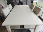 Houten tafel voor 4 tot 6 personen, kleur wit. Lengte 2m, breedte 1m, hoogte 79cm in goede staat, wel gebruikt. Gaat weg wegens andere plannen met de ruimte waar ze staat. De 4 lederen stoelen zijn oo