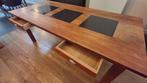 Teak eettafel (200cm x 95cm x 77cm) met 3 tegels en 2 schuifjes in goede staat 5x bijhorende teak stoel (rugleuning 104cm hoog - zitvlak op 45cm hoogt