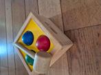 Houten speelgoed, heel goede kwaliteit. Met het hamertje klop je de ballen naar beneden en ze rollen naar buiten. Goed voor behendigheid