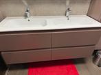 à vendre uniquement double vasques céramique blanc brillant et robinetterie (pas le meuble sous les vasques) dimensions: 141x51cm état neuf prix neuf