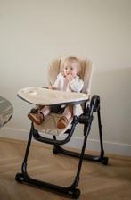 De kinderstoel heeft een afneembaar eetblad, die tevens naar achter te klappen is, waardoor hij gelijk opgeborgen wordt. Je neemt hem gemakkelijk van