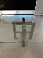 Vierkante glazen tafel 140cm, gelaagd veiligheidsglas van 1cm dik. Inox tafelpoot.