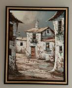 Schilderij van spaans schilder “pascual” mooi olieverfschilderij in houten lijst het toont een scène van een pittoresk dorpje met witte huisjes charmante rustieke stijl lijst is donkerbruin en goudkle