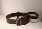 Riem voor heren leder met band die over de schouder gaat met stiksels lengte 102 cm breedte 5cm in zeer goede staat dik zwaar bruin leder, is een oude riem maar weet niet uit welke periode met inscrip