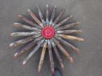 Roue à vent en bois composée de 20 moulinets à tisser. La roue éolienne a un diamètre de 1 mètre. D'ailleurs, il peut être placé dans le jardin et servir de roue à vent rotative ou éventuellement