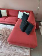 Hoeksalon met twee hoofdsteunen stoffen zetel met aan de onderzijde, zijkanten en achterzijde rood leer. Afmeting : +/- 2m50 op 2m15 gekocht bij henders en hazel - prijs bij toenmalige aankoop : 2.000
