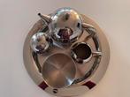 Deze prachtige metalen koffie- en theeset van zone denmark heb ik al 25 jaar. Op de schotel staan een koffiekan, een theekan, een melkkannetje, een suikerpot met lepeltje en een schaal voor chips of k