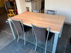 Stevig aluminium onderstel, melamine blad. Vast blad is 150cm lang en kan aan beide zijden 50cm verlengd worden met een handig klapsysteem. Ziet er nog onberispelijk uit. Gratis bij de tafel: vier bij