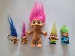 5 vintage trollen, - 1 grote met roze haar, met haar 18 cm., Zonder haar 10,5 cm. - 1 Potloodhouder trol met paars haar, 3,5 cm. -