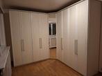 Une armoire d'angle, de 2,45 m de haut, peut être disposée en 3 pièces : une partie à gauche du miroir, le miroir et une partie à droite du miroir peuvent être installées en tant qu'armoires s