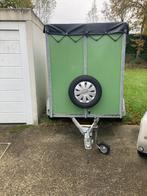 Aanhangwagen, gesloten. Dubbelas, met 5 nieuwe banden. Is met dakplaat in multiplex die beschermd wordt met een bache. Afmetingen: