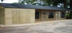 Paardenstal model zadeldak, leverbaar in diverse samenstellingen en variaties op maat! Luifel 1,00 meter, dak van asbestvrije golfplaten, buitenwanden van geïmpregneerde rabatdelen. De binnenwanden zi