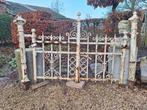 Ongeveer 175 cm tussen de palen niet gelast maar klinknagels zware kwaliteit gietijzeren palen zijn erbij alles samen 450 euro