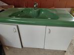 Complete badkamerset. Grote lavabo voor twee personen met hangkast onder en lichtbak om boven spiegel te hangen. Grote kast met