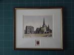 Zeer gedetailleerde ingekleurde pentekening van sint - martinuskerk en oud gemeentehuis van kontich (gemeenteplein), alsook het wapenschild van de gemeente , mooi ingelijst in een passe-partout achter