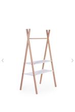 Deze stijlvolle houten standaard met wit wiegje is in perfecte staat en past in elk modern interieur. Het frame heeft een natuurli