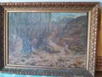 Représente un sous-bois animé. Dimensions : 57 x 40 cm toile et cadre à restaurer. Auteur inconnu période inconnue. Emplacement : braine-l'alleud