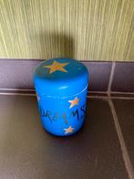 Mesures : 11,5cm haut x 8,5cm diamètre couleurs : bleu, doré, blanc, noir matériel : bois état : bon, un ou l’autre petit coup description : boîte en bois peinte avec des dessins