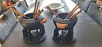 2 caquelons à fondue en fonte de la marque le creuset. En parfait état, comme neuf. Avec 2 poignées en bois, protège éclaboussures. Avec les fourchettes à fondue. Prix a la pièce sur amazone : 325&eur